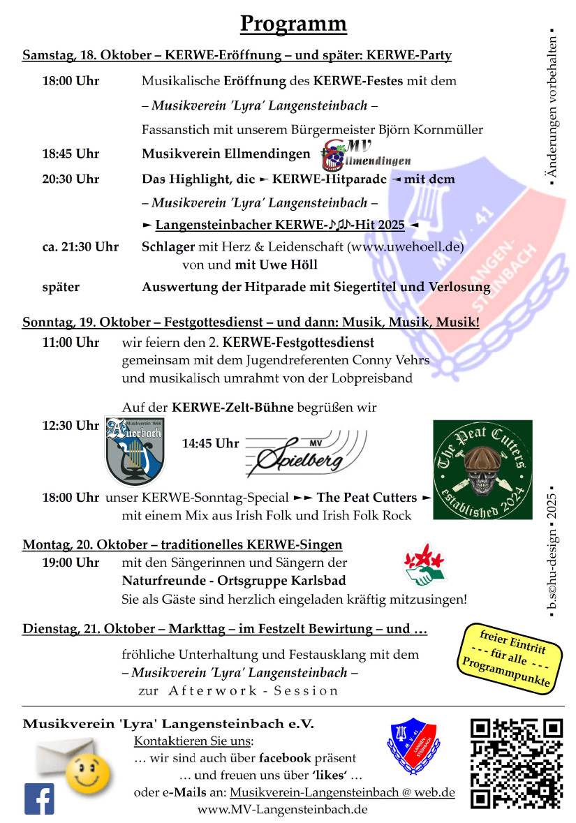 Nach dem Festgottesdienst am Sonntagmorgen dürfen Sie sich auf beste Blasmusik unserer befreundeten Musikvereine ebenso freuen wie auf einen gemütlichen Montagabend mit den Naturfreunden beim KERWE-Singen und natürlich dem Highlight der „Stoibacher KERWE“ – das Festzelt des Musikverein ‚Lyra‘ Langensteinbach e.V. mitten im Märktle am KERWE-Dienstag und unserer musikalischen Afterwork Session.